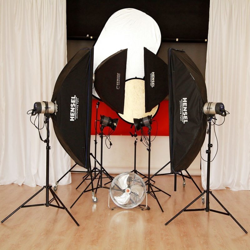 Оборудование - четыре источника Хенсель 500, два софта Хенсель 80х100, два стрипа Хенсель 150х30, два галогенных источника Фалкон мощностью по 1000 ватт (цветовая температура 3200К), вентилятор, отражатели.