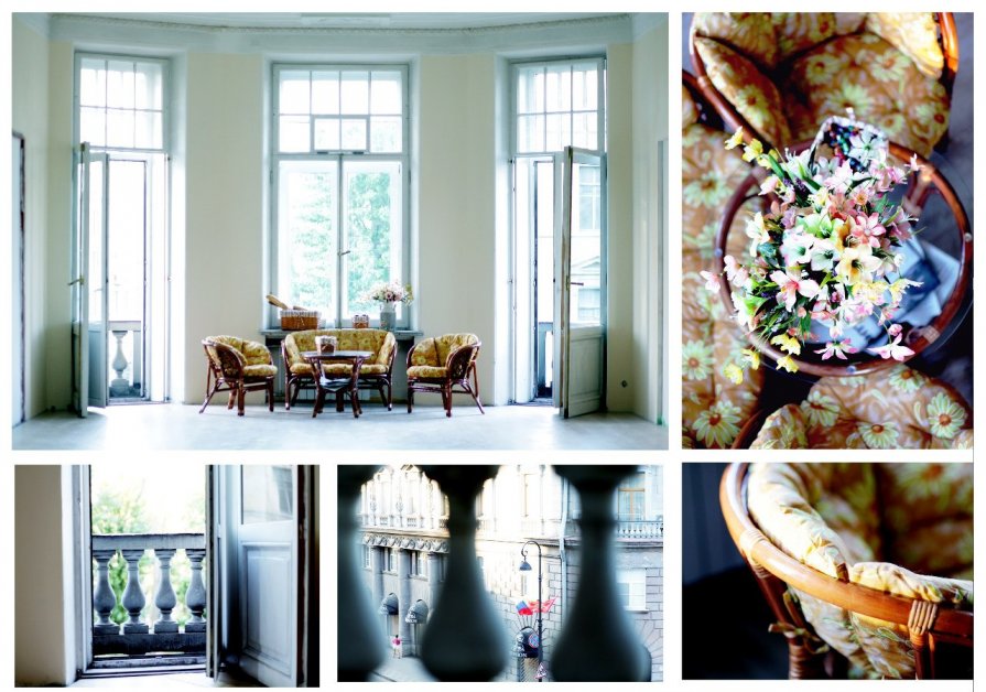 В зале три окна, два балкона (но они пока закрыты на зиму, откроем, наверно, в мае), комплект плетёной мебели, каминная полка, старинное высокое зеркало, лепной декор и бра на стенах. Дополнительный реквизит заказывайте у администраторов (мебель, крылья, ноги, хвосты и.т.д.)