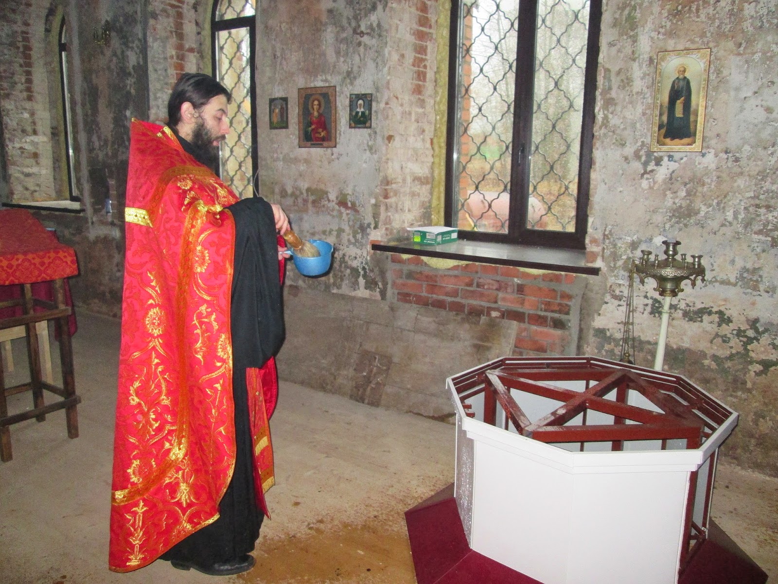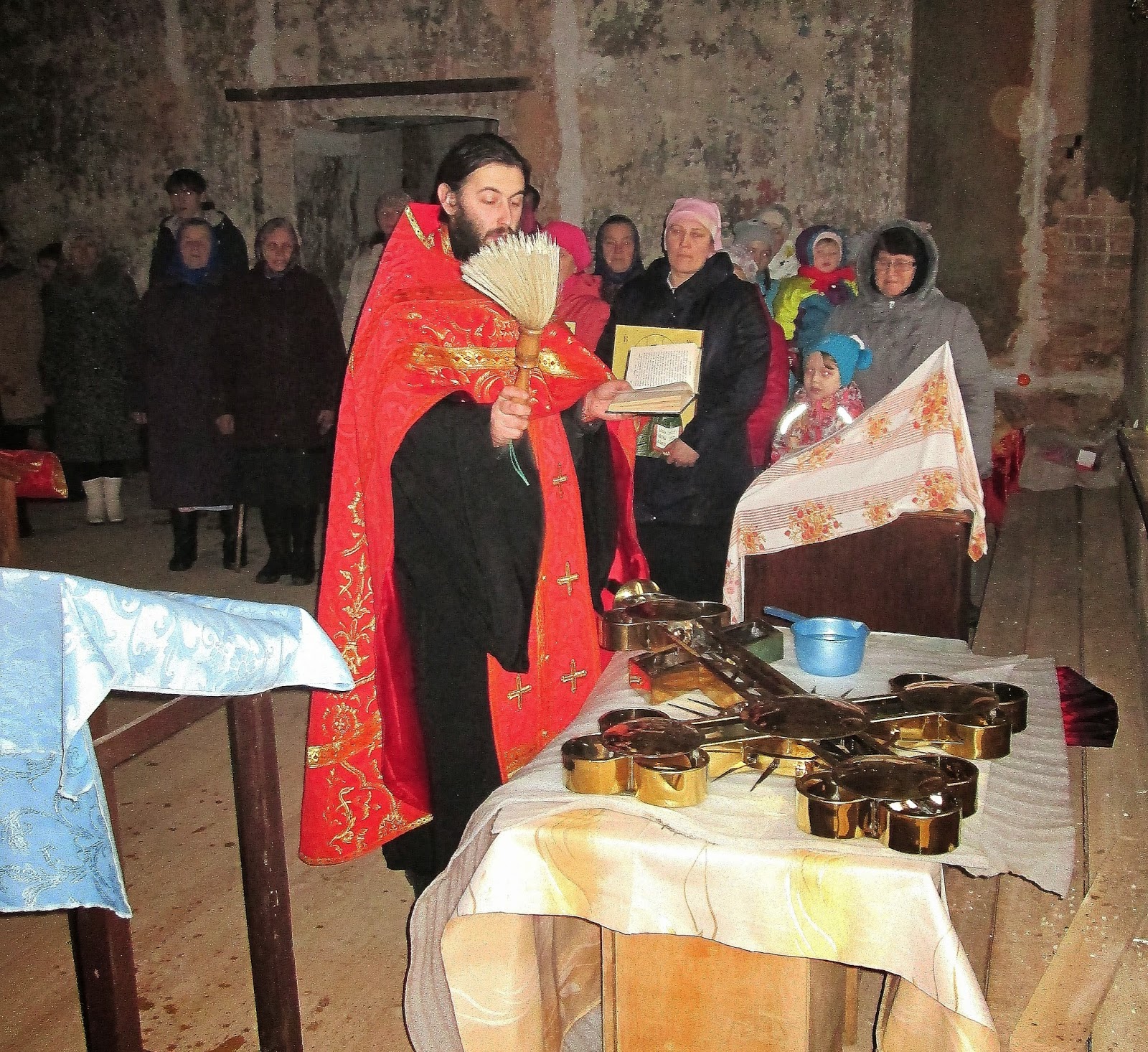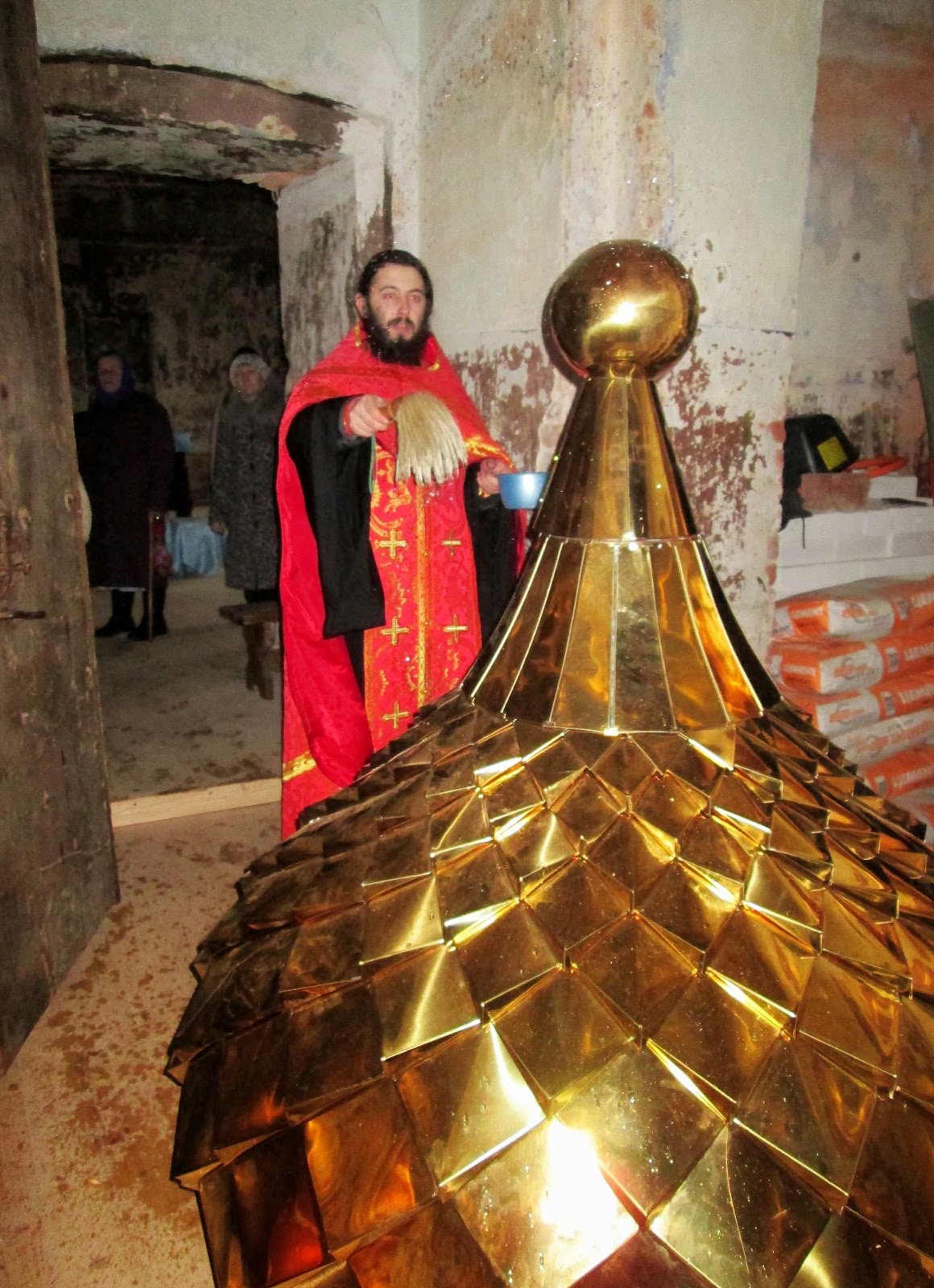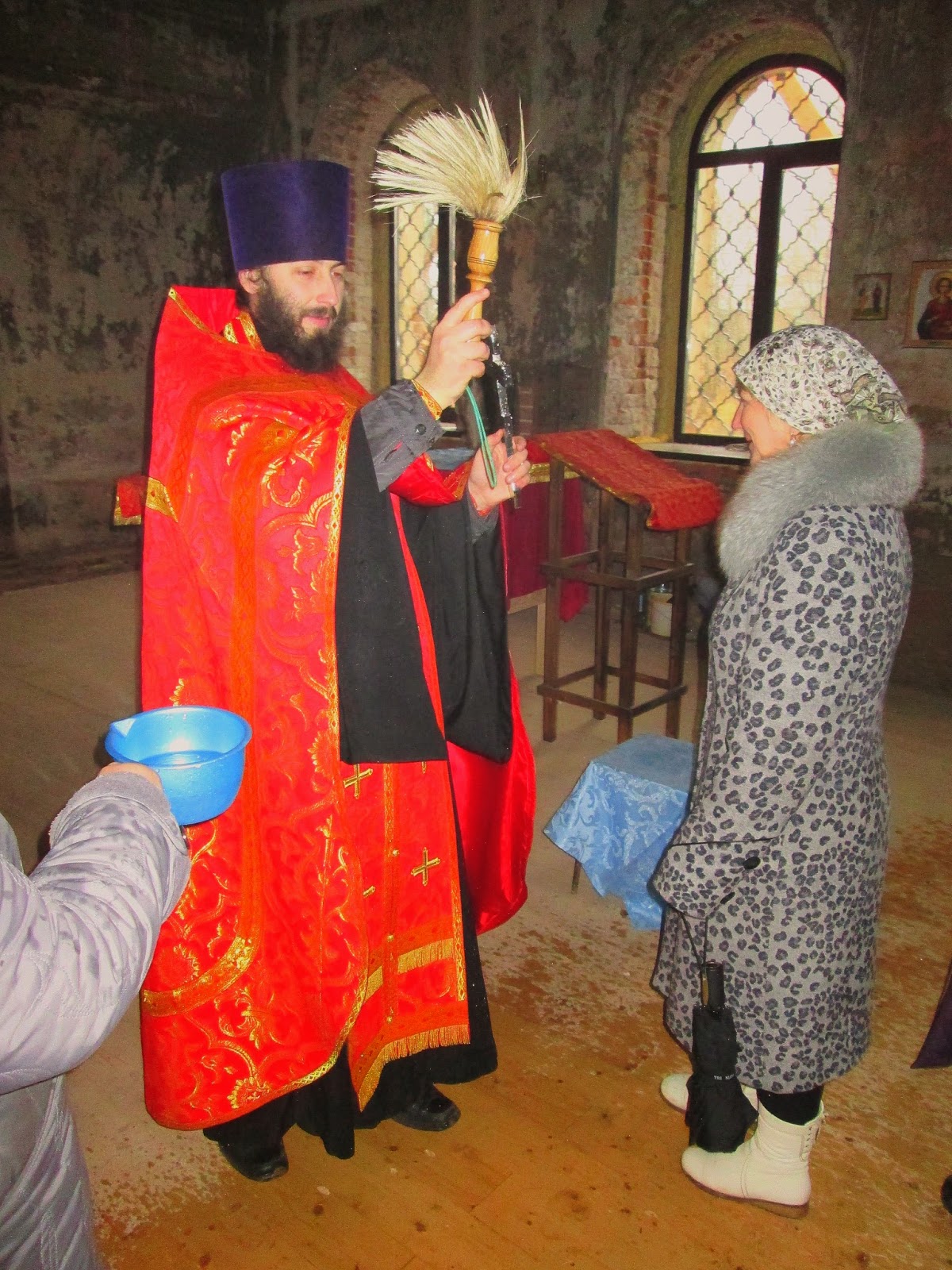 После обедницы – положенный в день престольного праздника крестный ход. Присутствующие взяли в руки иконы и пошли к храму, который, как я уже отметил, находится неподалёку. Здесь уже всё подготовлено к проведению чина освящения. Блестят крест и главка, здесь же, на полу храма, стоит барабан, на который и будет всё установлено после освящения. К этому моменту подошли ещё люди, и, что особенно отрадно, несколько детей. Так что молитвы, которые вознеслись в храме были ещё более значимей, чем те, которые звучали в конторе. Да и то, что всё действо происходило в церкви, тоже имеет большое значение. Храм оказался не такой уж необжитый. В трапезной части на стенах висят несколько икон, в центре помещения установлены столики и аналои, необходимые для проведения богослужений.