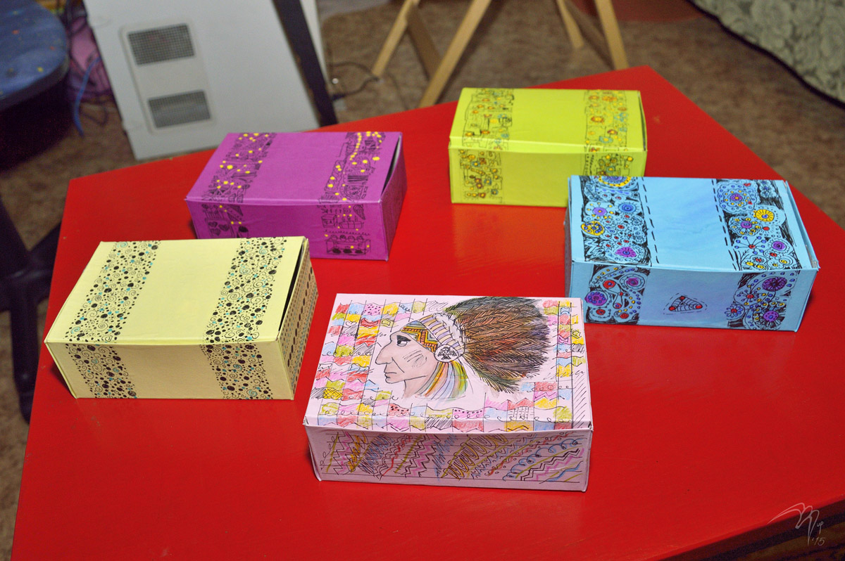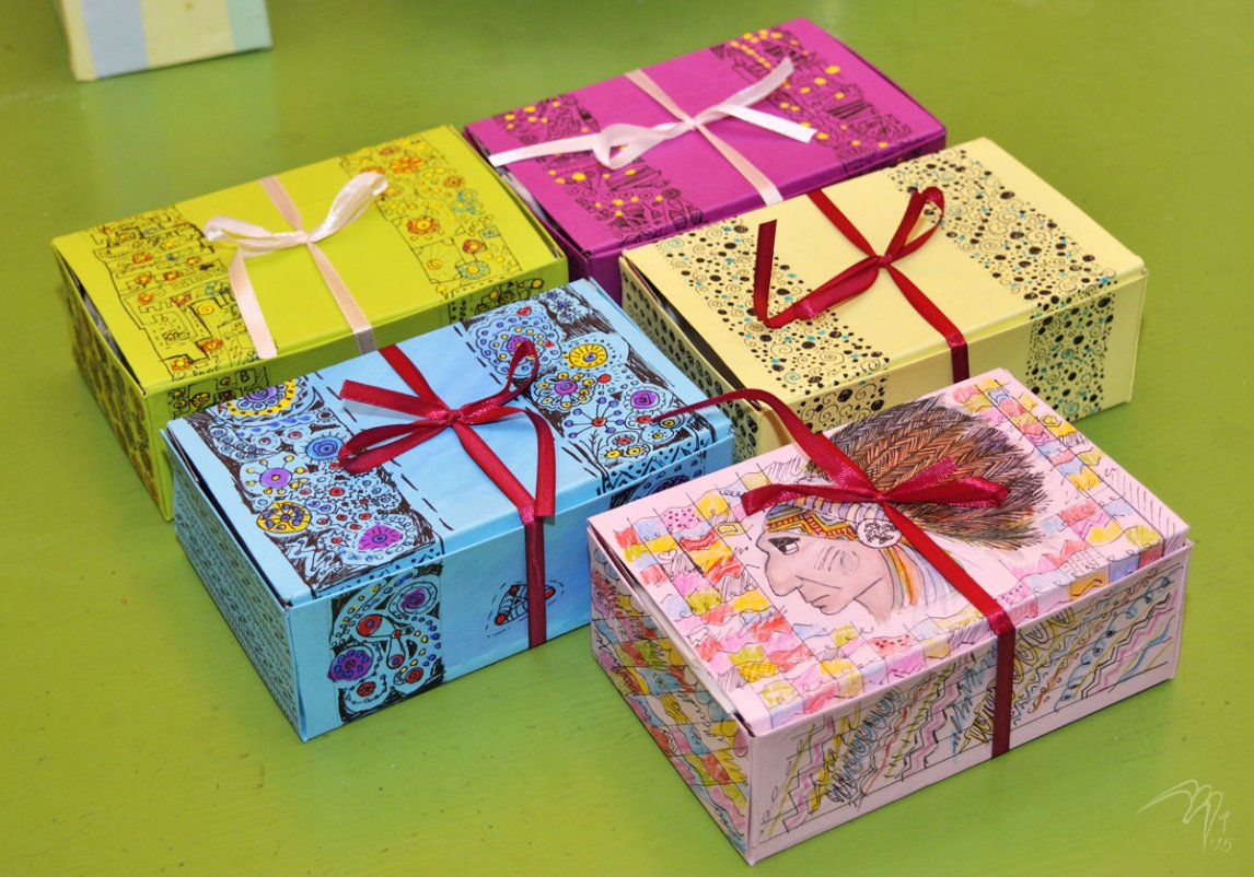 Жена с дочкой испекли вкусное творожное печенье, сделали коробочки под него, дочь их волшебным образом оформила, каждую по-своему, внутрь приклеили рецепт. Получилось, на мой взгляд, супер.