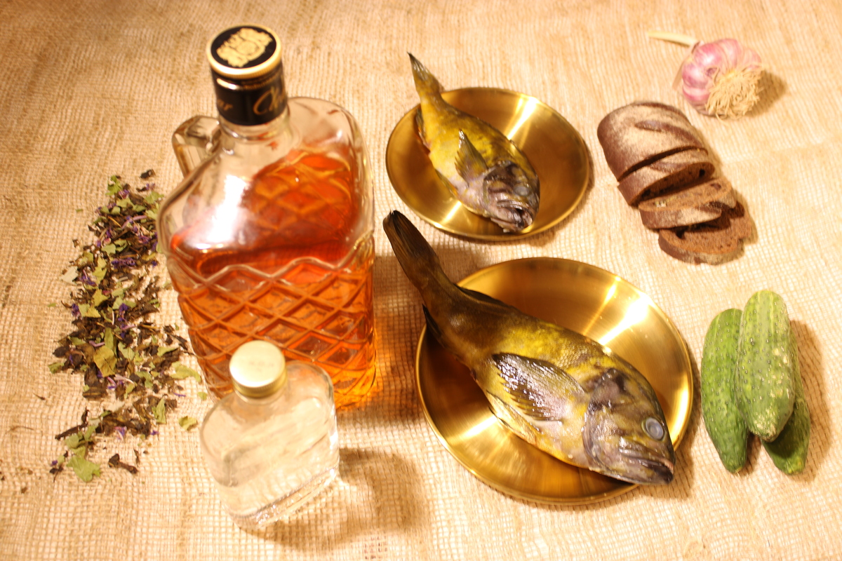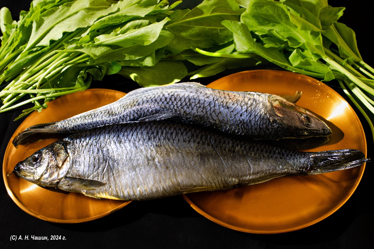6. Не забывайте о композиции: композиция должна быть гармоничной и привлекательной. Разместите морепродукты так, чтобы они выглядели максимально естественно и привлекательно. В качестве примера можно привести нашу фотографию, на которой две соленых сельди удачно контрастируют со свежими листьями щавеля (см. фото № 1 в Приложении). А вот на фото № 2 в Приложении представляем пример неудачной композиции. Мы пытались фотогравировать морскую рыбу, сочетая её с хлебом, свежими огурцами, чесноком, алкоголем (бренди, водка) и сушеным иван-чаем. Сама рыба на двух латунных тарелках разного диаметра, все на льняной ткани грубой выделки («рогожка»). Как бы мы не переставляли предметы, хорошая фотография так и не получилась. Очевидно, что сами предметы не сводятся в одну композицию, несочетаемые.